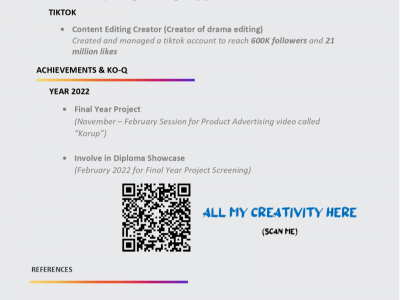 Studied Diploma In Creative Multimedia at Multimedia University (MMU), with 2 years experience in Retail & Consumer Goods.