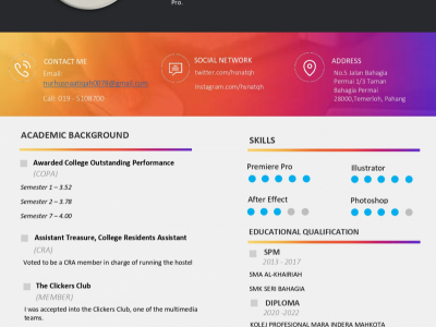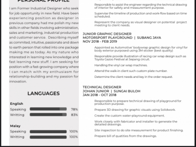 Studied Diploma In Computer Graphic Design at Kolej PolyTech Mara Batu Pahat, with 5 years experience in Marketing & Sales and Graphic Design.