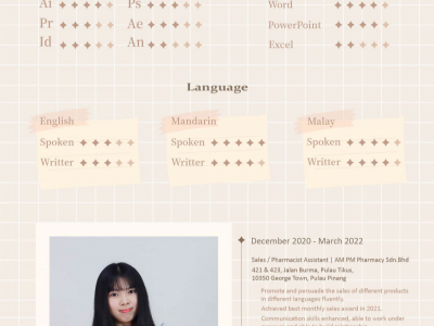Studied Bachelor's Degree In Media Studies at University Of Malaya (UM), with 4 years experience in Marketing & Sales and Public Relation.