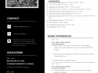 Studied Cinematography at UiTM Puncak Perdana, with 5 years experience in Media & Entertainment.