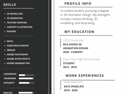 Studied BCA (Hons) In 3D Animation Design at UCSI University, with 1 year experience in Art & Design and Film.