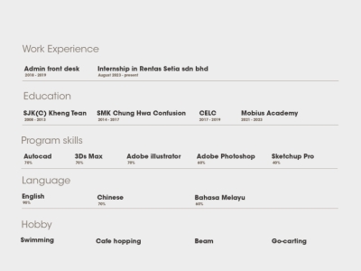 Studied Diploma In Interior Design at Mara Art & Design School, with 4 years experience in Logistics & Warehousing and Architecture.