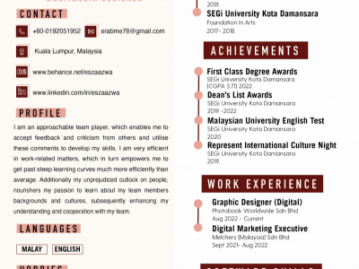 Studied Bachelor's (Hons) Multimedia Design at SEGi University Kota Damansara, with 2 years experience in Creative and Graphic Design.