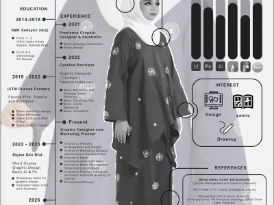 Studied AD120 at UiTM Cawangan Selangor, Kampus Puncak Alam, with 2 years experience in Graphic Design.