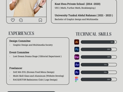 Studied Bachelor Of Arts (Hons) Graphic Design And Multimedia at Universiti TunKul Abdul Rahman (UTAR), with experience in Graphic Design and UI UX Design.