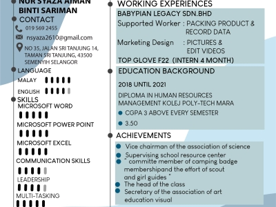 Studied Diploma In Graphic Design at KPTM Batu Pahat Johor, with 1 year experience in Food & Beverage.