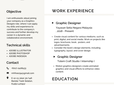 Studied Bachelor Of Art/Design/Creative Multimedia (Graphic Design) at Inti College Subang, with 5 years experience in Graphic Design.