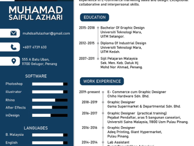 Studied Diploma In Graphic Design & Digital Media at Universiti Teknologi Mara (UITM), with 2 years experience in Food & Beverage and Apparel.