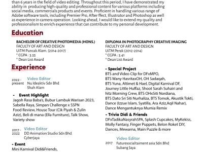 Studied Bachelor In Creative Photomedia at University Technology MARA, with 6 years experience in Media & Entertainment, Media & News and Creative and more.