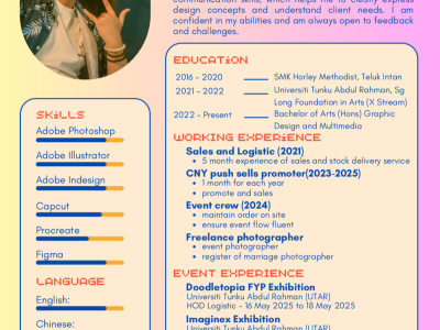 Studied Diploma In Graphic Design at Malaysia Institute Of Art, with 2 years experience in Branding, Social Media Post, Publication and more.