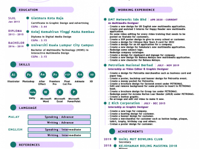Studied Bachelor Of Computer Science (Graphics And Multimedia Technology) With Honours at University Malaysia Pahang As-Sultan Abdullah, with 2 years experience in Graphic Design and Media & Entertainment.